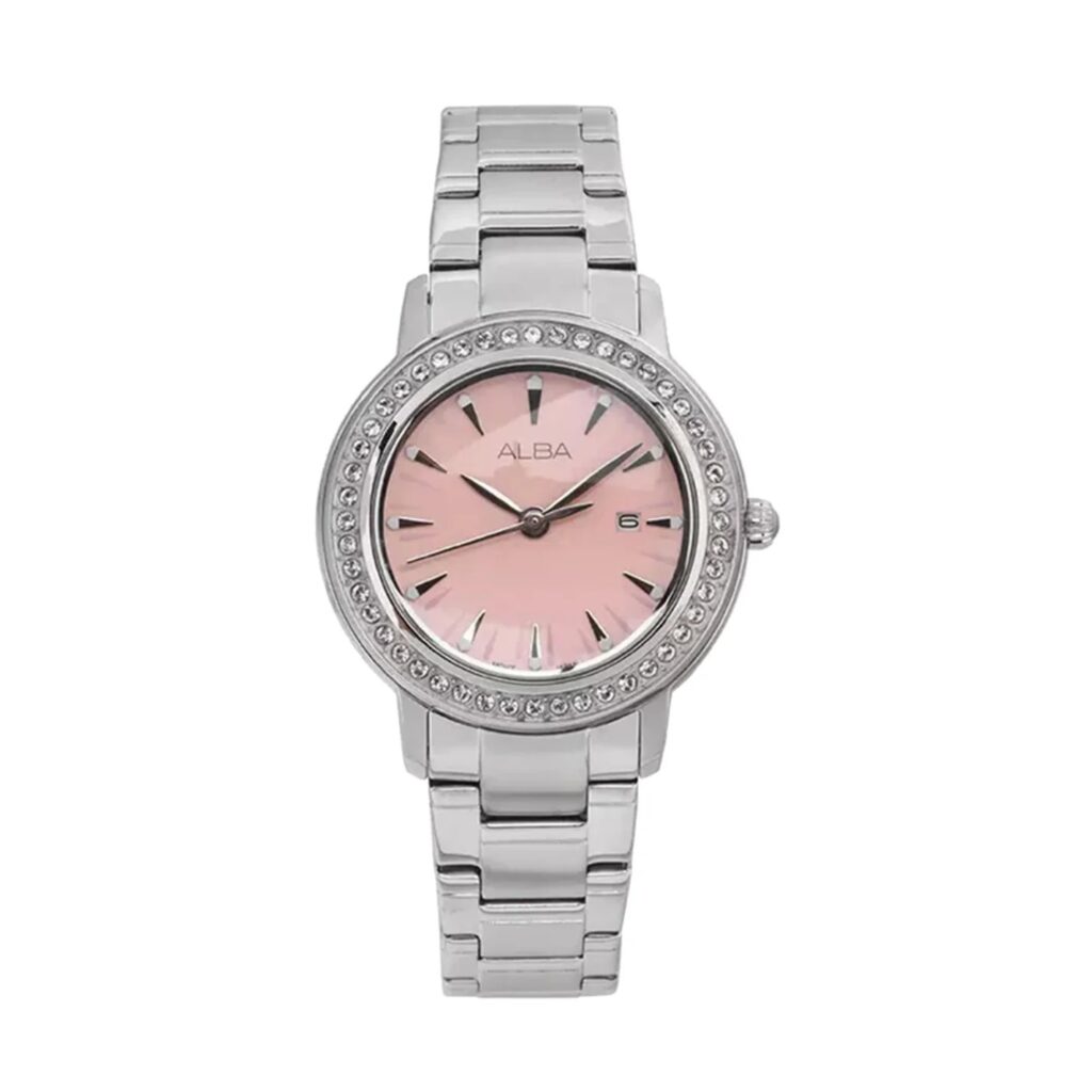The watch’s 33mm stainless steel case feels balanced on the wrist, while the light pink dial adds a subtle femininity that isn’t overly decorative. Its quartz movement ensures accurate timekeeping, while the date display function makes it extra practical.