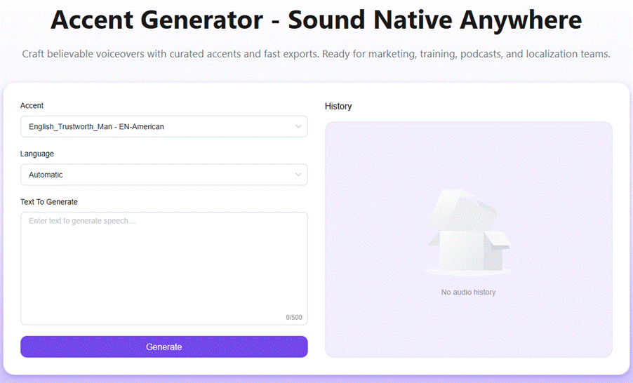 The entire workflow takes seconds, thanks to optimized AI processing. No downloads or installations required—just a browser and your ideas. This accent generator even includes a history feature to revisit past generations, streamlining revisions for ongoing projects.